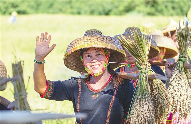 “砍山種植山蘭稻,一定要成功,煮好山蘭米,釀好山蘭酒,邀來(lái)親朋與好友,同慶好豐收……”當(dāng)天,在位于霸王嶺下的青松鄉(xiāng)擁處村的山坡上,一串串飽滿的稻穗已壓彎了稻稈;此時(shí),農(nóng)戶們?nèi)褰Y(jié)伴爬上山坡,弓下腰身麻利地?fù)]動(dòng)著手中的鉤刀開(kāi)割稻稈,在辛勤勞作之時(shí),還不忘哼起黎族歌謠分享著又是一年山蘭好收成的喜悅。山坡上辛勤勞作的喜悅,與正在山腳下舉辦的“啦奧門(mén)”山蘭文化節(jié)的喜慶氛圍達(dá)成了同一節(jié)拍。