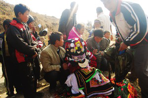 彝族人接親,是通過“搶”的方式進行的。接親者想早點兒背著新娘上婆家,而新娘的姐妹們則想讓新娘多留一會兒。當接親者來搶新娘時,圍在新娘身邊的姑娘們,把煙灰抹在手掌上,或拉著、或抱著、或追著去抹接親的人,那些接親者便一個個成為“黑花臉”,讓周圍的人們見了哄堂大笑。
