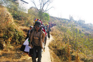 彝族結(jié)婚,須由男方派“顯姆”(接親隊)到女方家,把新娘背到婆家。背新娘的小伙子,多為新郎的弟弟或本家族中同輩分的青年。接親隊伍(馬兒、車輛也算在內(nèi)),必須以單數(shù)組成。