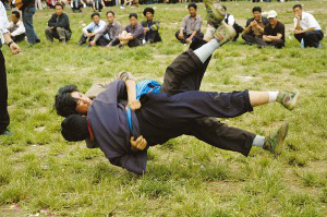 迎親宴畢,一般都要舉行摔跤比賽。先由女方家派人用酒邀請,接親隊伍應(yīng)邀派出選手。在比賽中,只有把對方摔倒在地才算贏,如果雙方同時倒地,則比賽無效。