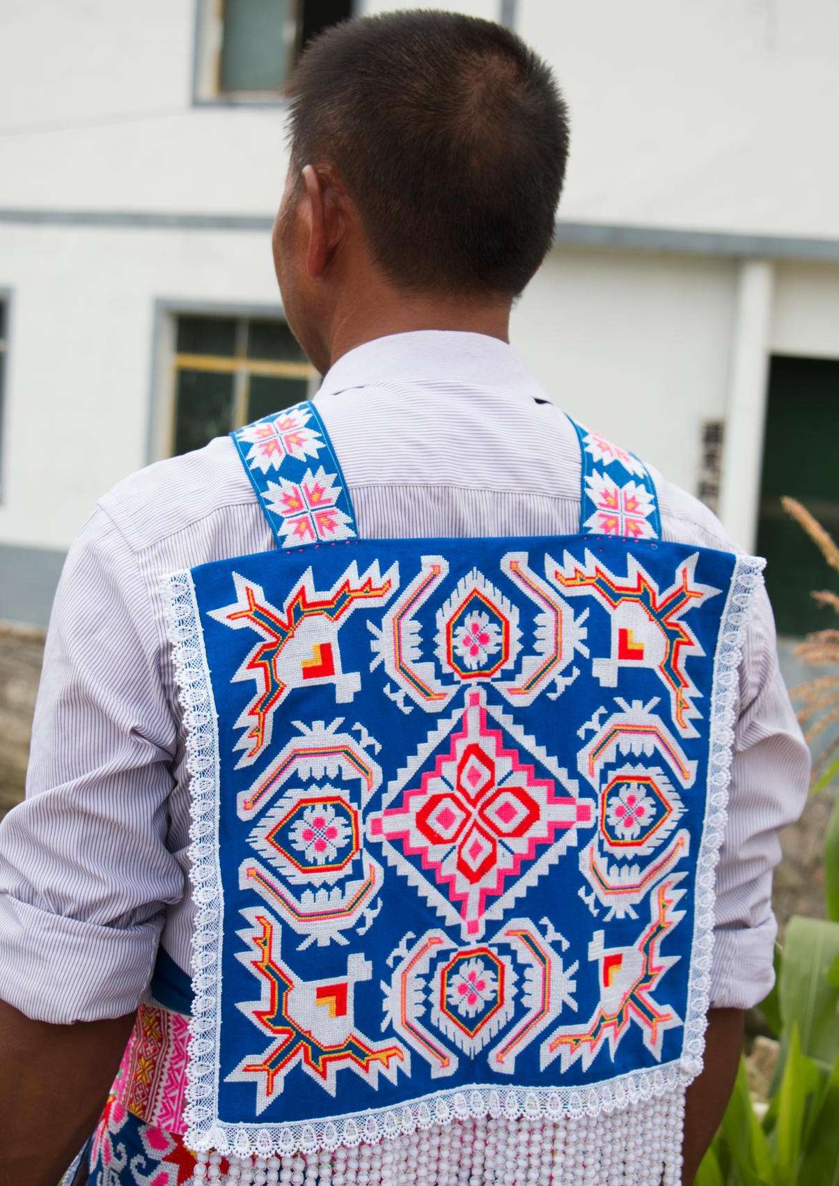 谷立村男子服飾相對(duì)于苗族女子服飾則顯得較為簡(jiǎn)樸,男子上身主要穿著白色打底的對(duì)襟衣,身后背有背牌,背牌底色為藍(lán)色,上繡有花朵圖案作為裝飾。下身主要以藍(lán)色打底的圍裙為主,身前圍裙,上面布滿刺繡圖案。身后的圍裙則為一條條獨(dú)立的絲帶,絲帶上同樣布滿花紋刺繡圖案,在其底部還串有珠簾作為裝飾。