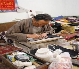 坐在工作臺上的赤列塔青,身材高大,穿一身合體的淺色藏裝,前擺上沾著幾星鼻煙,長期用針的手指有些變形。翻開他的履歷發(fā)現(xiàn),赤列塔青可以說是拉薩少有的制靴世家,他的父親邊巴頓珠在舊社會是個給人支差的貧苦鞋匠,靠給有錢人修鞋、做鞋為生。今年68歲的赤列塔青性格沉穩(wěn)、做事穩(wěn)健,他12歲當學徒工,做鞋做了56年,如果再加上父輩的修鞋歷史,時間更長。在今天的拉薩有這樣經歷的人算是屈指可數(shù)了。赤列塔青從小就在父親和師傅身邊打下手,逐漸掌握這個足以養(yǎng)家糊口的一技之長,終于成長為一個勤奮而多才的手工藝人,開始了穩(wěn)坐一隅的匠人生涯。