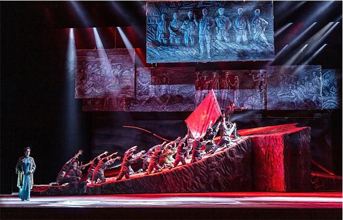 在舞蹈語言的設(shè)計上,編導(dǎo)融入當(dāng)代元素,使觀眾不但感受到審美的親切與現(xiàn)代感,而且還自然地進入回望歷史的情境,對其思想內(nèi)涵的理解更為準(zhǔn)確。該劇的道具使用和調(diào)度也頗為大氣,令人印象深刻。一組斜坡狀的大型舞臺道具不但由群眾演員直接移動而實現(xiàn)即時的場景調(diào)度,還可使演員上下和左右而行,最終組合成巨大的中國共產(chǎn)黨黨徽,輔助完成了人民英靈和英雄的形象塑造。