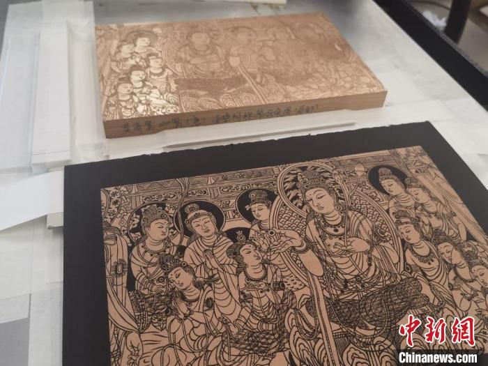 “將敦煌壁畫濃縮雕刻在木板上難度非常大,飛天裙裾要飄逸,菩薩的眉眼要有神,一刀都不能雕錯(cuò)?!毙鞎x林最近剛完成以莫高窟444窟和57窟的壁畫為原型的雕版畫,目前累計(jì)完成上百件敦煌題材的雕版畫。