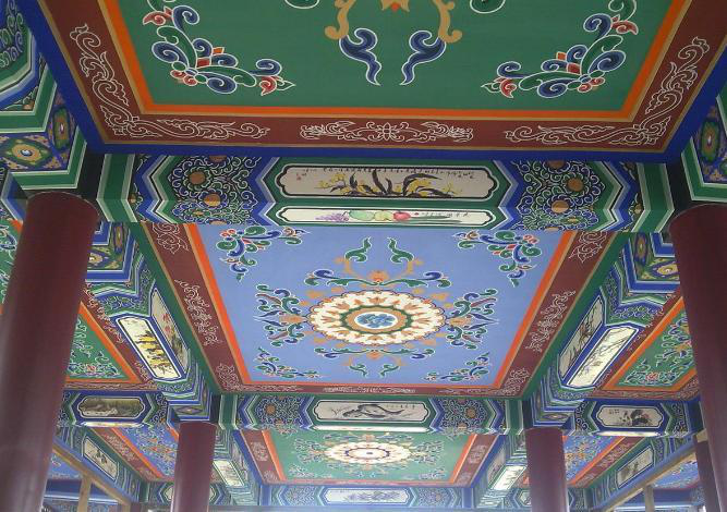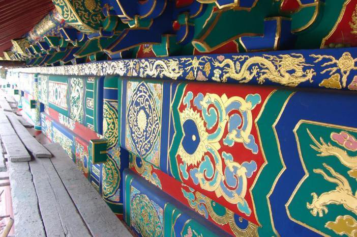 彩畫著色是一項(xiàng)關(guān)鍵的工序,不能有半點(diǎn)差錯(cuò)。工匠們?yōu)椴煌伾O(shè)定了代號,一米色、二淡青、三香色、四硝紅、五粉紫、六洋綠、七佛青、八石黃、九紫色、十黑煙、十一紅等。將代號直接寫在地仗上,然后根據(jù)色號將各種色料對號入座,涂刷著色一、二遍,待干后再刷一遍光油罩光,以起保護(hù)作用。彩畫所用色料一般均為各色成品油漆。