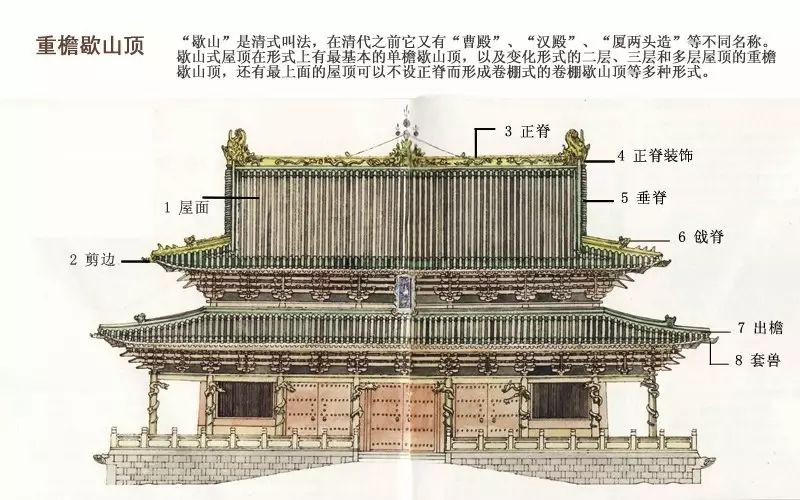 6. 戧脊:在歇山頂建筑中,垂脊的下方從博風板尾處開始至套獸間的脊,叫做“戧脊”。