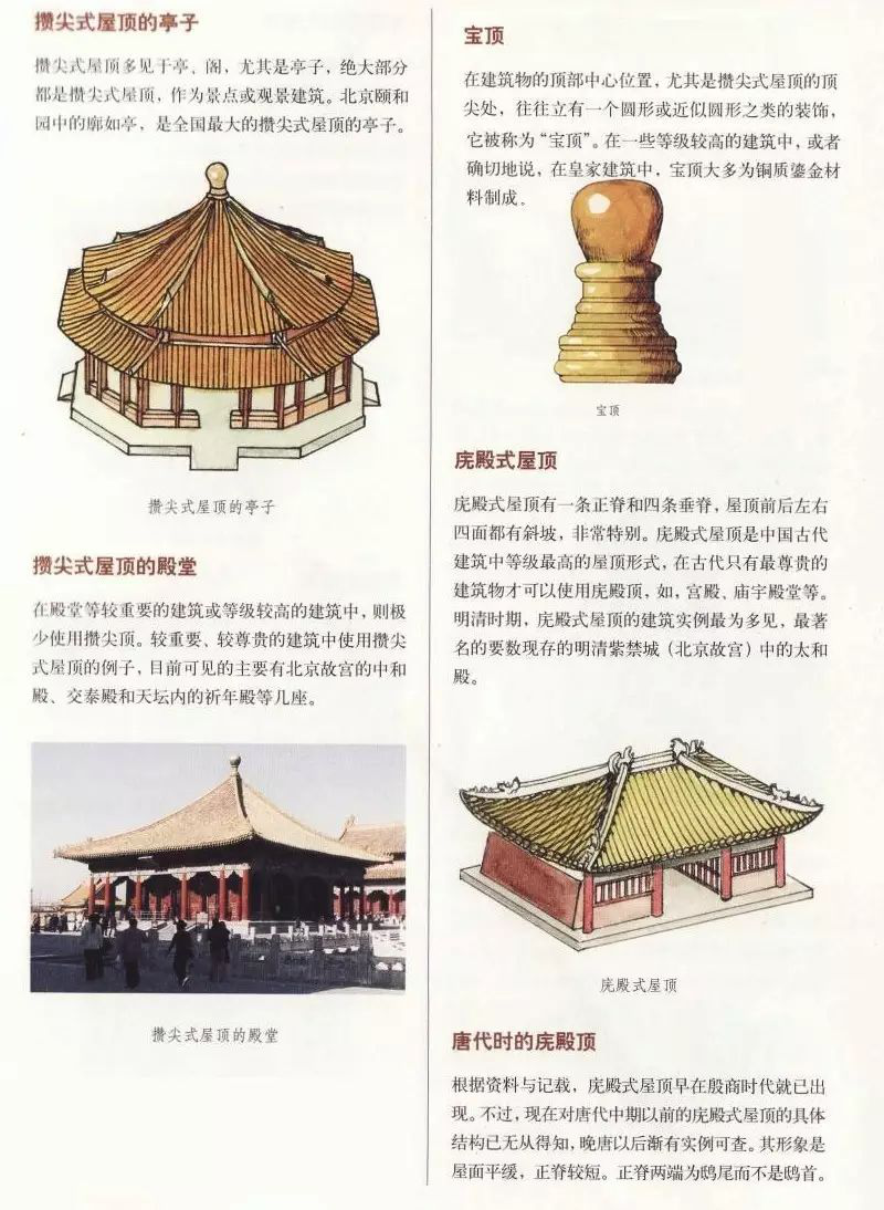 無正脊,只有垂脊,只應用于面積不大的樓、閣、亭、塔等,平面多為正多邊形及圓形,頂部有寶頂。根據脊數多少,分三角攢尖頂、四角攢尖頂、六角攢尖頂、八角攢尖頂。此外,還有圓角攢尖頂,也就是無垂脊。攢尖頂多作為景點或景觀建筑,如頤和園的郭如亭、麗江黑龍?zhí)豆珗@等。在殿堂等較重要的建筑或等級較高的建筑中,極少使用攢尖頂,而故宮的中和殿、交泰殿和天壇內的祈年殿等卻使用的是攢尖頂。攢尖頂有單檐、重檐之分。