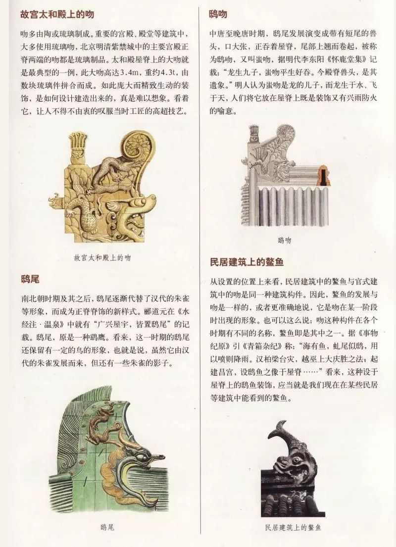 4. 正脊裝飾:在我國古代的很多建筑中,特別是一些等級較高的建筑中,其屋頂正脊上往往設有各色裝飾。除了常見的正脊兩端的吻合正脊中心的寶頂外,在正脊的前后兩個立面上,還會雕飾或塑有花、草或龍等。