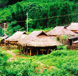 云南省滄源佤族自治縣翁丁村的村民都是佤族,村寨建在大山里一個平緩的小山頂上。房屋依山勢地形而建,分布隨意,沒有一致朝向,多年自然生長形成的荊棘叢成為村寨的柵欄。進寨的路口有竹木搭建的寨門,寨子附近有茂密的竹林和充足的水源,還有保護很好的祭祀神林。寨內(nèi)都是佤族的傳統(tǒng)民居——“四壁落地房”,即以3根帶長杈原木作柱梁,用平直的細木條作椽子,椽子上覆蓋事先編好的茅草排,用藤條綁扎固定。四壁用竹篾編成柵墻,向東面開一道門。房頂至房檐斜度大,房檐離地面不足1米,幾乎看到墻壁,以老虎窗(一種開在屋頂上的天窗)采光,并設小曬臺,當?shù)厝诵蜗蟮胤Q之為“雞籠罩房”。