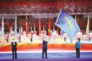 閉幕式上舉行了全國少數(shù)民族傳統(tǒng)體育運動會會旗交接儀式,第十二屆全國少數(shù)民族傳統(tǒng)體育運動會將于2023年在海南省舉辦。 民族畫報社記者 趙利 攝