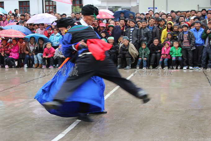 蹲斗,彝語叫“互布吉則”,意思是雄雞斗架。勞動之余,男子常進(jìn)行蹲斗比賽。雙方各為一、兩人。兩手合掌并于胸前,呈半蹲狀態(tài),相互用左肩撞右肩,或右肩撞左肩,不準(zhǔn)用手推;以碰撞使對方的手、臀部先著地為贏。另一種比賽方法是蹲著繞圓圈或走“之”字形,參加人數(shù)不限,以堅持時間最長為勝。
