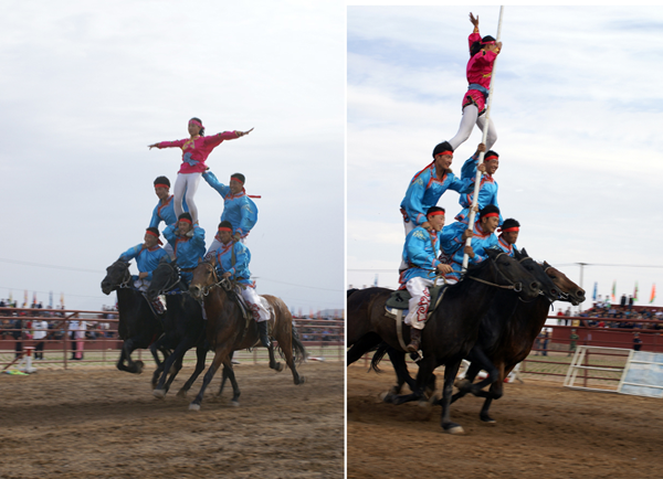 蒙古族的馬術(shù)表演非常精彩,有很多項(xiàng)目。“跨越障礙”是在運(yùn)動場跑道上每隔幾十米設(shè)置一個高1米的跨欄。跑道終端立著一個直徑約2米的火圈,矯健的坐騎從起跑線踏蹄起跑,越過跨欄,鉆過火圈直達(dá)終點(diǎn)?!俺笋R斬劈”是在200-250米的距離之間樹起十幾個目標(biāo)。騎手們手持馬刀,疾馳如飛,經(jīng)過一個個目標(biāo)時舉刀劈砍,刀起標(biāo)落?!榜R上技巧”是由運(yùn)動員們在飛馳的馬背上做出各種造型動作。運(yùn)動員一般八九歲就要在馬術(shù)隊(duì)接受嚴(yán)格的訓(xùn)練。技巧表演可分單項(xiàng)和多項(xiàng),其中又包括單人單馬、單人雙馬、雙人雙馬和多人多馬。一匹飛奔的馬經(jīng)過騎手身邊,騎手可以突然抓住馬鬃翻身上馬,又會突然下馬腳尖點(diǎn)地再躍上馬背。其他技巧還有在馬背上“空翻倒立”“側(cè)方隱蔽”“樓里藏身”以及驚險的“馬上疊羅漢”等表演【如圖,劉軍攝影,編者修剪合成兩圖】。