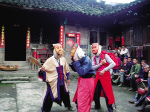土家族陽(yáng)戲在貴州、湖南、重慶等省、市都有流傳,湖南省張家界陽(yáng)戲和重慶酉陽(yáng)陽(yáng)戲均被列入了省級(jí)非物質(zhì)文化遺產(chǎn)名錄,得到保護(hù)和重視。貴州沿河土家族自治縣的土家族陽(yáng)戲同樣古樸而充滿風(fēng)韻,5月19日,當(dāng)?shù)氐囊慌幕ぷ髡邤M通過(guò)挖掘整理,把獨(dú)具地方特色的面具陽(yáng)戲申報(bào)為省級(jí)非物質(zhì)文化遺產(chǎn),希望沿河陽(yáng)戲同樣受到重視和保護(hù)。