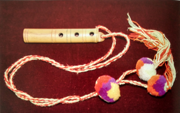 直笛,傈僳語(yǔ)稱(chēng)之為“迪哩吐”(如圖),多用蘆葦制作,長(zhǎng)約5寸,有4個(gè)圓孔,3孔在正面,1孔在背面,音量較小,音色柔和動(dòng)聽(tīng),為青年男女抒情和求愛(ài)必要的工具。