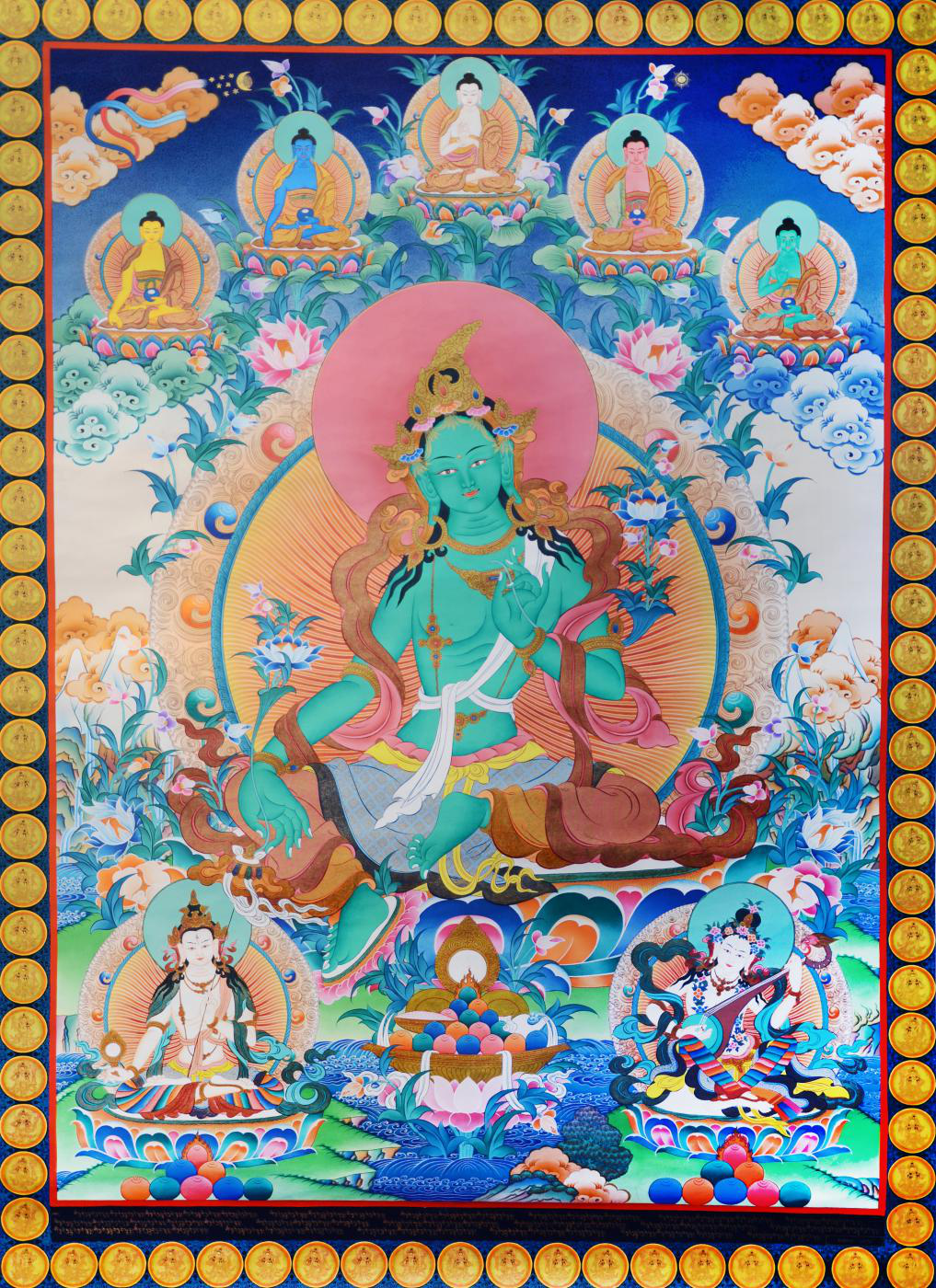 綠度母坐菩薩座于蓮花月輪上,雙腳屈左展右,左腿單坐,右腿向下舒展,踏在蓮花上表示隨時(shí)準(zhǔn)備起身救度苦難眾生,如慈愛(ài)的母親一般,拯救鐘愛(ài)的孩子;