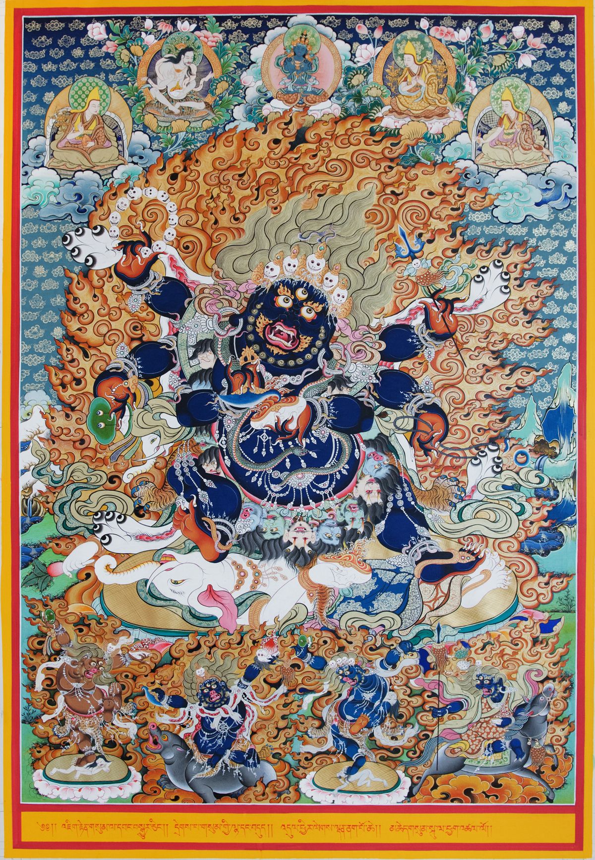 他面容猙獰恐怖,獠牙外露,三目圓睜怒視。頭發(fā)向上直立,眉間點有朱砂“仙都那”印記(梵文Sindura),象征一切空行之懷懾力量。頂戴五骷髏冠,項配五十新鮮頭顱。如果仔細觀看唐卡中護法頭部頂端,飾有一個小小的金剛杵,這是用來象征不動金剛。