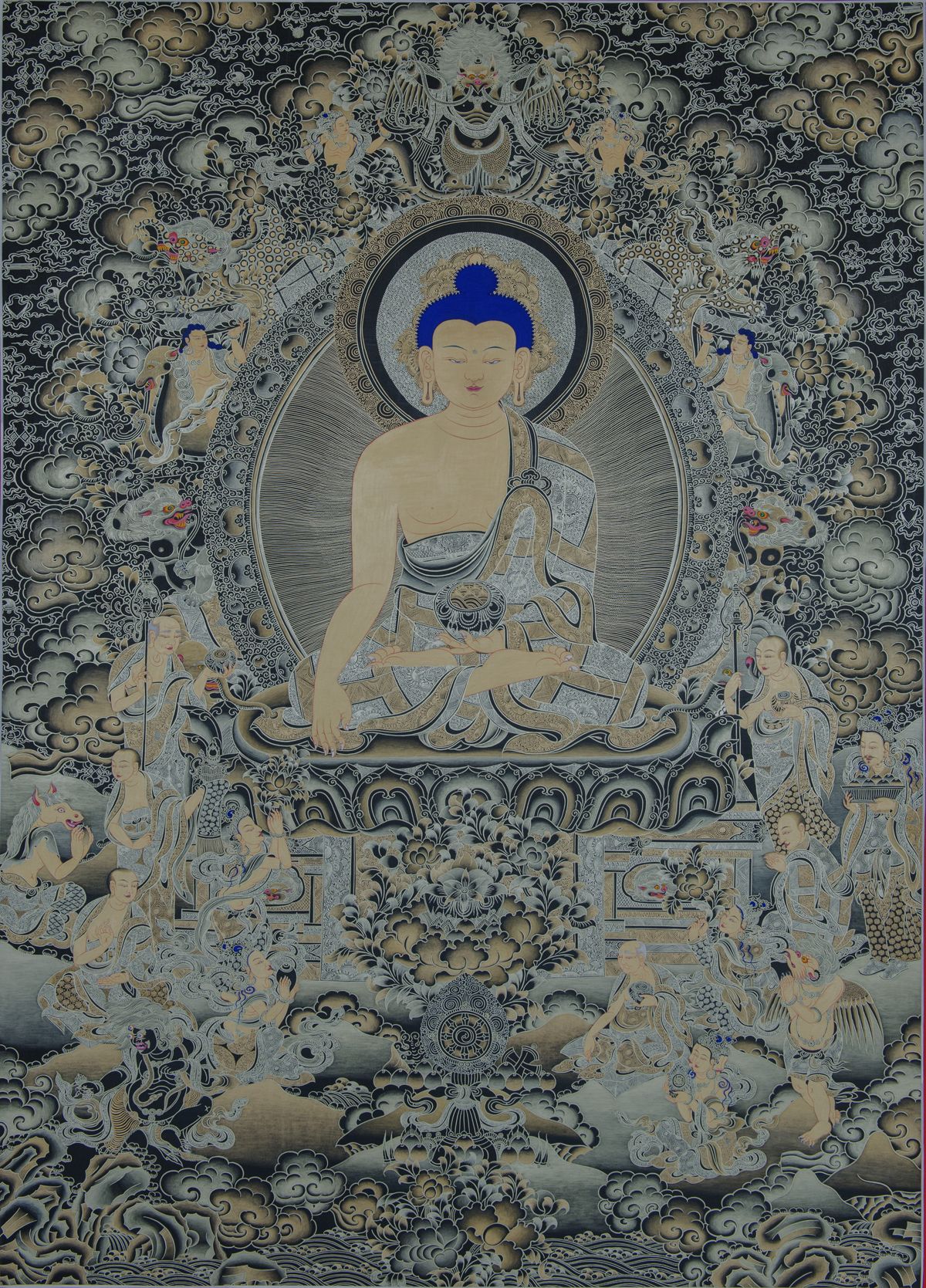 此唐卡是夏吾尖措畫(huà)家通過(guò)幾個(gè)月的辛勤勞作制成的又一大師級(jí)巨作。其制作工藝、顏料調(diào)配法都是夏吾家族幾代畫(huà)家傳承下來(lái)的絕世密法。原料也都是由祖先留下來(lái)的黃金用傳統(tǒng)秘方磨成水粉之后畫(huà)家用調(diào)好的黃金粉進(jìn)行畫(huà)布上勾勒主尊釋迦牟尼佛祖,四周供奉為佛祖五大比丘,僑陳如、馬勝、婆沙波、大名、和跋提聽(tīng)法灌頂。左右供奉為兩大梵天菩薩、國(guó)王、大上師等在傳授佛祖的初轉(zhuǎn)法輪場(chǎng)景,大護(hù)法在蓮花寶座下庇護(hù)惡魔降妖,背景用花鳥(niǎo)、山水、祥云等線條來(lái)襯托整個(gè)畫(huà)面的層次與審美。