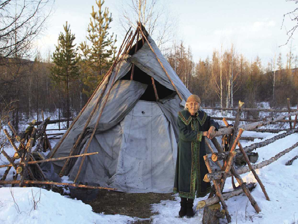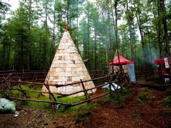 撮羅子的選址,是在地勢(shì)較高、陽(yáng)光能照射到而且水和柴草就近可取的平坦之處。其蓋造方法,是用三五根約碗口粗細(xì)上有枝杈的木桿,相互交合搭成上聚下開的骨架,然后再用30根左右木桿搭在骨架之間捆綁固定,在南面(或東面)留出門,即基本成型。木桿搭起的只是“屋架”,外面還要覆蓋才能遮風(fēng)擋雨。按照季節(jié)的不同,分別用樺樹皮、草簾子和犴、狍等獸皮,做成自上而下一層壓一層的圍子,綁在木桿上,門簾則夏用草或樹條編,冬用狍皮做成。
