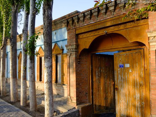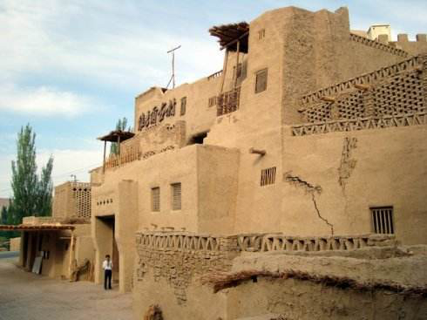 維吾爾族的傳統(tǒng)民居多為帶有地下室,農(nóng)家還用土胚塊砌成晾制葡萄干的鏤空花墻的晾房。住宅一般分前后院,后院是飼養(yǎng)牲畜和積肥的場地,前院為生活起居的主要空間,院中引進渠水,栽植葡萄和杏等果木,葡萄架既可蔽日納涼,又可為市場提供豐盛的鮮葡萄和葡萄干。信仰伊斯蘭教的民族喜好清潔,很重視沐浴,特別講求水源的潔凈。在沒有渠水可引的地方,幾乎每戶都在庭院自打一口井,并嚴格保護水源,使其不受污染。