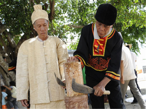 黎族樹皮布制作技藝:黎族制作樹皮布的歷史悠久,樹皮布是人類衣物從無紡布向有紡布發(fā)展的歷史見證。據(jù)考古學家研究,海南島樹皮布的歷史約有4000年。延續(xù)了數(shù)千年的樹皮布,記載了人類發(fā)展的歷程。盡管樹皮布已失去了它往日的作用,可是黎族人民卻不能忘記祖輩傳承下來的技藝。如今在哈方言、潤方言黎族中,有些家庭將制作樹皮布的技藝代代相傳,他們的子孫仍能識別制作樹皮布的樹種,并能掌握制作樹皮布的技術(shù),這對研究黎族早期無紡布有著重要的意義。然而,目前整個海南省掌握樹皮布制作技藝的民間藝人不足5人。