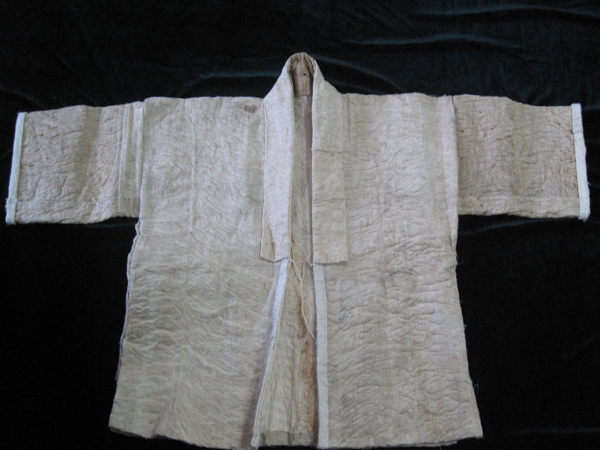 據(jù)了解,制作樹皮布的樹種有厚皮樹、黃九樹、構(gòu)樹(學名為楮樹)、見血封喉(又稱箭毒木)等,以見血封喉的樹皮加工出來的樹皮布質(zhì)地最好。制作樹皮布的步驟是:第一步:扒樹皮。首先制作能夠敲打和剝離樹皮的工具、選取樹干筆直、不長節(jié)、木質(zhì)較為堅硬的樹木,砍成長40厘米、直徑為5厘米的兩根木棍。一根用刀把一頭削細,用于敲打樹皮;另一跟把一頭削成木楔狀,用于剝離樹皮。根據(jù)需要制作的物件大小,扯一根藤,量一下樹干上方和下方之間的長度,再用鉤刀在樹的上、下方各砍一道記號,然后用木棍在記號的范圍內(nèi)敲打樹皮,使其蓬松,與樹干分離。在敲打的過程中,有經(jīng)驗者通過聆聽木棍敲打在樹干上的聲音,就可以辨別出哪里還沒有敲打夠,于是繼續(xù)敲打該處,直到感覺整個樹皮已經(jīng)與樹干完全分離,這時才用鉤刀在上、下方作記號的地方把樹皮砍一圈,中間用刀豎著劃一道口子,再用特制的木楔棍一點一點地撬樹皮,將樹皮進行片狀剝離。第二步:休整。將剝離下來的整塊樹皮壓平,除掉表皮,削掉節(jié)疤,拍打樹皮纖維,使其松動。第三步:漂洗。在水中進行搓洗拍打,脫去樹膠,保留軟狀的樹皮纖維。第五步:曬干。將脫膠后洗凈(含有大量水分)的樹皮纖維晾干。第六步:拍打。把曬干的樹皮纖維拍打整平,使樹皮纖維分布均勻,呈片狀,于是制成樹皮布。最后將樹皮布裁剪、縫綴。縫制樹皮衣的工序是:先把軟狀的單層樹皮布折成雙層,按人體結(jié)構(gòu)的大小裁剪出領(lǐng)口、袖口,再用自制的麻線縫綴成衣物。