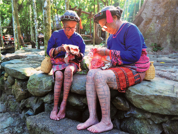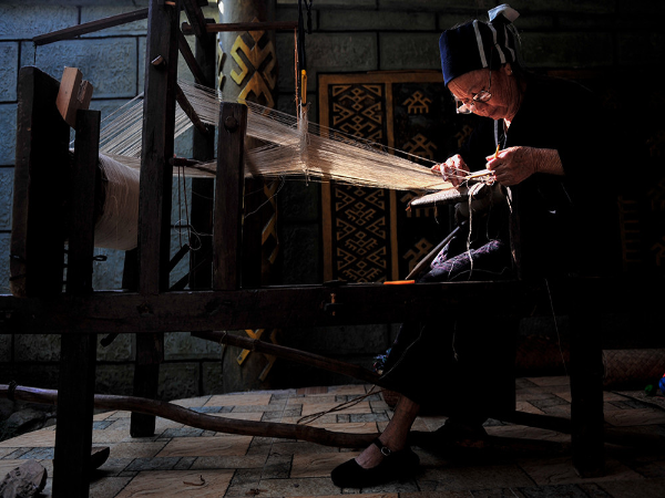 “織”是指使用踞腰織機,采用通經(jīng)斷緯的紡織方法織出各種花紋圖案,在織布時,先手工掛經(jīng),綁住藤或樹皮布腰帶,用腳踩織機的經(jīng)線木棍,席地而坐織布??椈ㄊ怯煤谏蛩{黑色做底線(經(jīng)線),根據(jù)圖案需要,將各種染色的線搭配,拉經(jīng)線、投緯線(彩色線),用木刀打緊緯線,織出各種花紋圖案。