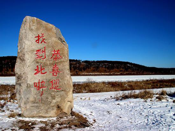 沿著形態(tài)各異的“北”字,可以走到中國最北端的廣場——北望埡口?!皷|經(jīng)122°20'43。48〃E北緯53°29'52。28〃N”的標志就立在這里,旁邊一塊巨石上刻著“中國北極點”。