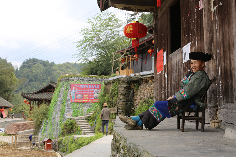 石拔三大媽的家位于村口,老人正在院子里曬太陽(yáng)。這里的苗族習(xí)俗保持得很好,村民日常生活中大多是苗族傳統(tǒng)打扮。大媽頭裹黑帕頭、穿一件綠色繡花苗裝,利落得很。見來(lái)了客人,她趕緊把我往屋里讓。