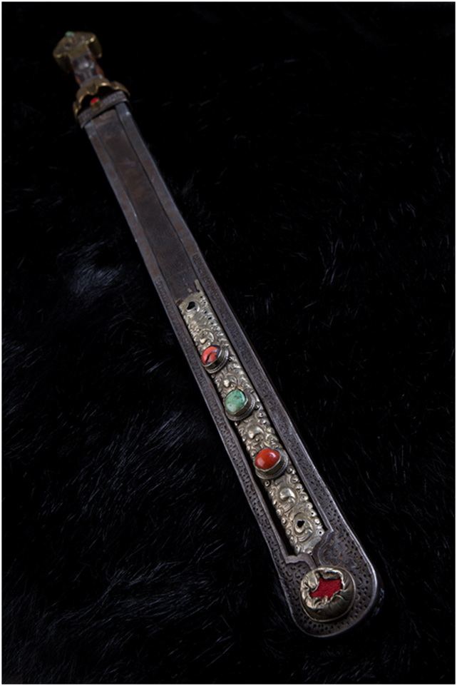安多地區(qū)主要以放牧為主,牧民的刀主要用于宰殺和吃肉,有嚴格的男用女用之分,男式刀長度在一尺以上,女式刀在一乍左右,刀鞘的底部和刀柄的末端上翹,呈船形。安多人喜歡珠寶,頭飾、胸飾、腰飾無不光燦耀人,這些飾物同樣被用在刀上,刀鞘和刀柄錨金錯銀,鑲嵌著珊瑚和綠松石,像精美的藝術(shù)品。