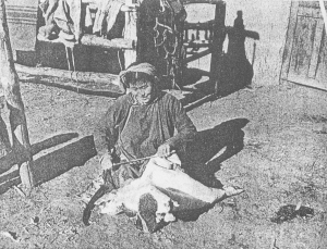 這之后,我們來到鄂倫春族的一個(gè)定居點(diǎn)——托河做調(diào)查。托河保留著比較完整的鄂倫春族狩獵文化,男人們打獵、捕魚,女人們則負(fù)責(zé)做飯、熟獸皮、用皮子做衣服等。女人縫獸皮衣時(shí),用的針還是骨針,線則是野獸的筋。當(dāng)然,她們還用樺樹皮做各種生活用品,如籃子、盒子、筒子等。