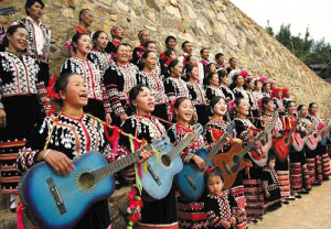 與城市里的歌手抱著吉他唱流行歌曲不同,雅厄藝術(shù)團(tuán)的團(tuán)員是在吉他的伴奏下彈唱屬于自己民族的民歌。這些民歌既有古老的原生態(tài)民歌,又有新創(chuàng)作的民歌??粗淮笕捍┲G麗的民族服飾,背著吉他在臺(tái)上又彈又唱的農(nóng)民,人們無(wú)不從他們身上感到快樂(lè)、自由。對(duì)他們而言,吉他彈唱已不是一種炫技和才華展示,而真正成為了生命中不可或缺的一部分。