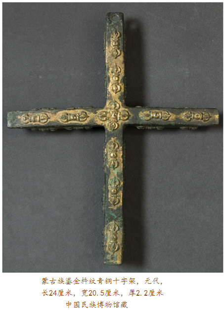 眼前此件在內(nèi)蒙古達茂旗出土的元代鎏金青銅十字架,四面排列有浮雕金剛杵紋,其正面每個金剛杵圖案上均有鎏金裝飾,十字架上部穿孔則可用于懸掛。金剛杵是藏傳佛教里的修行法器,象征力量與智慧;而十字架則是基督教文化的標志,如此混搭,歷史便要傳遞出種種:在信仰藏傳佛教的蒙古高原,金剛杵,象征無畏圓滿,十字架,則代表救贖重生,東西方文化的結(jié)合亦呈現(xiàn)某種文明可能達到的無可比擬之高度。