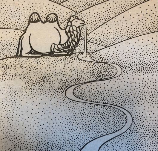 高興之際,大家想起了馱經(jīng)馱水土的駱駝;但是人們四下里一看,白駱駝不見了。真是,為了找水喝竟把勞苦功高的駱駝丟失了!大家找呀,找呀,找了一夜還沒找到,天亮時,又回到燒茶的地方,然后順水而上,繼續(xù)尋找。走不多遠,發(fā)現(xiàn)駱駝在前面靜靜地臥著,人們高興極了,有一個人三步兩步跑上去拉駱駝,可是駱駝一動也不動。眾人上前詳細一看,白駱駝已變成了石頭。那石駱駝在水里臥著,一股清水從它的嘴里噴出來,散發(fā)看清香的氣味,流向遠方。
