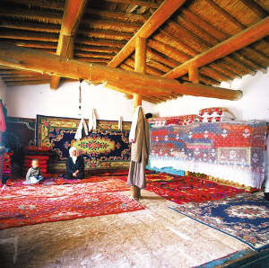 土房的室內(nèi)除有的搭火炕外,其它的裝飾和木房的一樣。到了采收紅花的季節(jié),鮮紅欲滴的紅花曬滿了院子,形成獨特的風景。不論哪個房間,都可作為臥室,也用于待客,廚房和儲藏室單建,有的還單建馕坑。