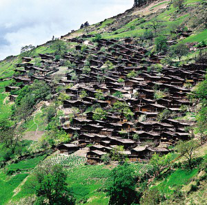 在怒江上游峽谷聚居的傈僳村寨都建在高山的半山上,其民居俗稱為“千腳落地房”。說“千腳落地”雖有些夸張,但也足以形象地說明峽谷溫?zé)岬臍夂蚝蜕礁咂露傅牡乩項(xiàng)l件。在雨季時,“千腳”阻力最小,使山洪順利傾瀉而下,又很快干爽,免受潮氣。而且不需挖地動土,不必移石砌墻,對木料沒有過高要求,長短皆用,在生態(tài)脆弱的高山峽谷也算環(huán)保建筑?!扒_落地”是因建房時先在確定的屋基上依斜坡程度和住房面積打進(jìn)數(shù)十根到百余根木樁為基樁,以保證居室樓板的平正?;鶚洞蚝煤?,除四面留幾根高柱作為整個房屋的立柱外,在密集木樁所形成的平面上滿鋪竹篾編織的樓板,還有竹篾圍墻,所有結(jié)構(gòu)皆用竹篾綁扎。屋頂鋪苫草或蓋木片瓦,近幾年,已陸續(xù)換上了大塊的水泥波形瓦。房門開在山墻一側(cè),有廊道,可做曬臺,平時穿的衣服都搭在這兒,也是婦女做針線活的地方。隨著怒江峽谷的開發(fā)和新農(nóng)村建設(shè)的深入,通路的村寨將很快會改變面貌。