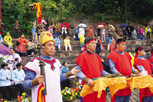 煙雨迷蒙中,頭飾百合花的童男童女,手捧水果籃的少男少女,以及身著傳統(tǒng)服飾的老年男女等,在祭師的帶領(lǐng)下魚貫進入祭祀場。
