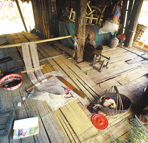 樓上住人、煮飯、貯藏糧食,樓下圈養(yǎng)牲畜。以簡易板梯上下,有小廊道。室內(nèi)順梁開前后兩道門,中間的通道將屋內(nèi)分成兩部分。右側(cè)為客房,設(shè)火塘,供佛像;左側(cè)為家人臥房,以竹篾隨意分隔,無門,只擋一布簾,通風(fēng)透光。正門一邊搭曬臺,用來曬糧、曬衣服和洗漱。住房一側(cè)多建有附房,用以堆柴、舂米、放置生產(chǎn)工具和雜物。