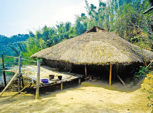 云南省潞西市三臺山鄉(xiāng)的德昂族居住分散,村寨很小,大都建在高半山上,山路行車?yán)щy。傳統(tǒng)住房為正方形干欄式竹木建筑,房屋兩層,為木柱結(jié)構(gòu)框架,竹篾編片圍墻,粗竹劈壓成自然的竹片做樓板,屋頂苫草排,當(dāng)?shù)厮追Q“草帽頂房。”