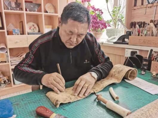 “觸網(wǎng)”是萬德順應(yīng)時代的一次嘗試,也是他手工皮藝之路的又一次轉(zhuǎn)型。12歲時,他從馬背上摔下來,在舅爺家休養(yǎng)時第一次接觸到皮雕,并與皮雕結(jié)下不解之緣。42歲時,萬德在手術(shù)中發(fā)生意外導(dǎo)致癱瘓。經(jīng)歷了迷茫、絕望的他,決定重拾老祖宗留下的手工皮藝,在輪椅上把傳承家族皮雕手藝作為后半生奮斗的事業(yè)。