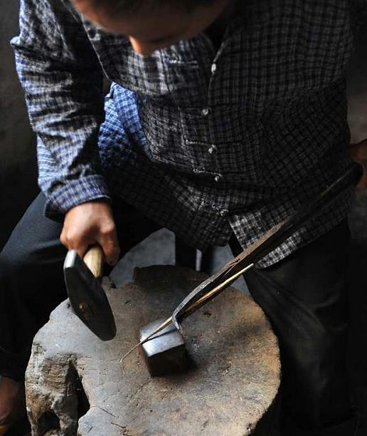錘打:將熱銀錘打成四方形長(zhǎng)條或圓柱狀細(xì)條,再根據(jù)制作需要,做成片形或條形。