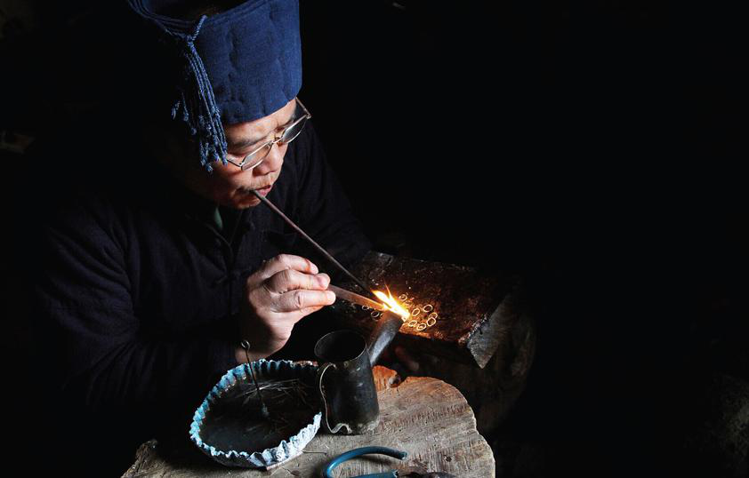 銀飾鍛制是苗族民間獨(dú)有的技藝,所有飾件都通過(guò)手工制作而成。銀飾的式樣和構(gòu)造經(jīng)過(guò)了匠師的精心設(shè)計(jì),由繪圖到雕刻、制作有30道工序,包含鑄煉、捶打、編結(jié)、焊接、洗滌等環(huán)節(jié),工藝水平極高。