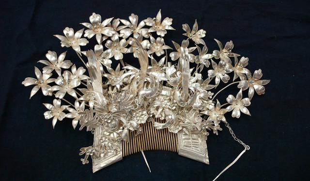 苗族銀飾鍛制技藝歷史悠久,先后經(jīng)歷了從原始裝飾品到巖石貝殼裝飾品、從植物花卉飾品到金銀飾品的演進(jìn)歷程,傳承延續(xù)下來(lái),才有了模式和形態(tài)基本定型的銀飾,其品種式樣至今還在不斷地翻新,由此形成的飾品鏈條成為苗族社會(huì)演進(jìn)的象征之一。貴州省雷山縣、黃平縣、劍河縣、臺(tái)江縣和湖南省鳳凰縣五個(gè)地區(qū)的苗族銀飾鍛制技藝已入選國(guó)家級(jí)非物質(zhì)文化遺產(chǎn)名錄。