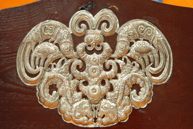 流傳于劍河境內(nèi)的苗族銀飾通常以龍、虎、昆蟲(chóng)、花鳥(niǎo)等動(dòng)植物圖案為基本素材,加上鏈狀絞花、鏨花、壓花、編花相互配合,精美中透著靈氣。劍河苗族銀飾根據(jù)造型不同,分為三個(gè)片區(qū):革東片區(qū)的項(xiàng)圈為鏈狀絞花式;南寨片區(qū)的項(xiàng)圈為板圈式;久仰片區(qū)為橫板頭式。