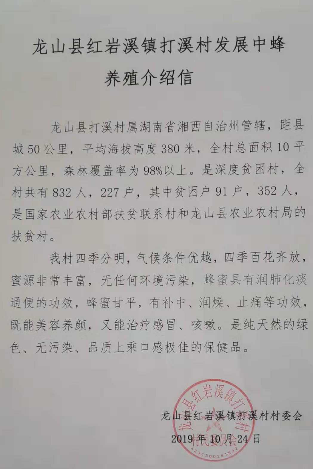 這里四季分明,氣候條件優(yōu)越,四季百花齊放,蜜源非常豐富,無任何環(huán)境污染。據(jù)湖南省湘西州龍山縣紅巖溪打溪村支部書記沈世平介紹:“我們這兒已經(jīng)有很長的養(yǎng)殖蜜蜂的歷史,環(huán)境無污染,田土少,屬于純天然養(yǎng)殖,無農(nóng)藥,利于中蜂的養(yǎng)殖,并且在2019年4月份的時候,通過農(nóng)業(yè)部及農(nóng)業(yè)科學(xué)院的專家實地考察,認證為最佳養(yǎng)蜂環(huán)境。今年獲得鄉(xiāng)政府幫扶,規(guī)劃從龍山縣中心養(yǎng)殖合作社引進50箱進行集中養(yǎng)殖,明年開始分設(shè)4點,一個點150箱,擴大產(chǎn)量,并向全縣推廣?!?/p>