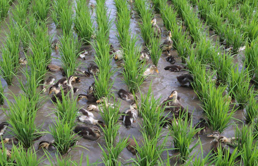除了科技富硒外,過灣富硒米還采用了稻鴨共作的種植技術(shù)。鴨子以天然水草和水生物為食,免去除草劑的使用,直接代替人工解決了除草和除蟲。同時(shí),鴨子在稻田間游動不僅加強(qiáng)水稻根部的空氣流動,促進(jìn)水稻的呼吸作用,同時(shí)也可以耙田濁水,促動水田流動,疏松土壤,刺激水稻生長。鴨糞落入稻田也是天然有機(jī)肥,給水稻補(bǔ)充天然養(yǎng)料。因此這種稻鴨共作的方式不僅利于環(huán)境的保護(hù),也可以在適當(dāng)提高水稻產(chǎn)量,利于鴨子的生長,形成有益的生態(tài)循環(huán)。
