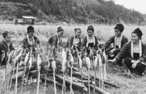 廣西三江侗族自治縣舉辦高山稻魚(yú)文化節(jié),當(dāng)?shù)氐某檀濉⒘伎?、富祿等鄉(xiāng)鎮(zhèn)以稻田抓魚(yú)、烤魚(yú)、風(fēng)情表演等活動(dòng),吸引游客前往體驗(yàn)原汁原味的侗鄉(xiāng)稻魚(yú)文化,樂(lè)享金秋豐收喜悅。近年來(lái),該縣傾力推進(jìn)“種稻養(yǎng)魚(yú)”特色產(chǎn)業(yè),將傳統(tǒng)優(yōu)勢(shì)轉(zhuǎn)化為資源優(yōu)勢(shì),并大力發(fā)展生態(tài)鄉(xiāng)村游,推銷(xiāo)高山生態(tài)健康食材,使群眾脫貧增收。圖為當(dāng)?shù)厣贁?shù)民族婦女在該縣富祿苗族鄉(xiāng)富祿村稻田內(nèi)烤魚(yú)。