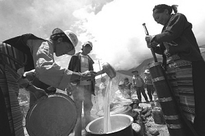 其實(shí),在《舌尖上的中國1》里,酥油茶就亮相了。攝制組跟拍了到拉薩朝圣的一家人,他們風(fēng)餐露宿,條件艱苦,但只要能起火架爐,燒一鍋滾燙的酥油茶,圍坐在篝火邊美美地喝個(gè)夠,旅途的辛勞似乎就煙消云散了。