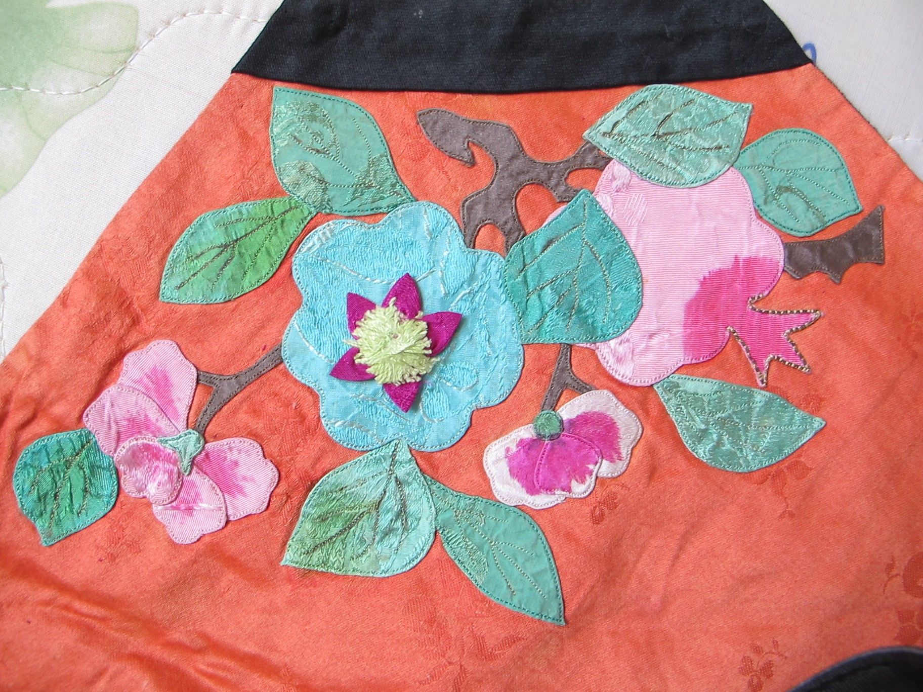 第四步是刺繡。機(jī)繡作品雖然操作簡便,速度快,工作效率高,但由于不能隨時調(diào)換粗細(xì)不同的機(jī)針或不同顏色的機(jī)線,圖案比較簡單,繡法也不能象手工繡那樣靈活多變,所以東鄉(xiāng)族婦女對能充分施展本領(lǐng)的手工繡情有獨鐘。