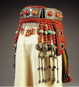 【圖為清代鄂爾多斯珊瑚松石銀牌鏈盛裝頭飾,中央民族大學民族博物館館藏】