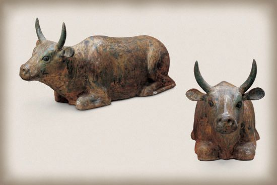 青銅鑄造,中空,外表通體鎏金。牛屈肢而臥,雙眸遠(yuǎn)眺,四肢有力,體態(tài)健壯,比例勻稱,線條流暢,造型形象逼真,個(gè)體碩大。該銅牛制作時(shí)需要將冶煉、模具雕塑、澆鑄、拋光和鎏金等工藝集于一體,真實(shí)地反映出西夏青銅鑄造工藝的高超水平,是西夏金屬工藝品的杰出代表。